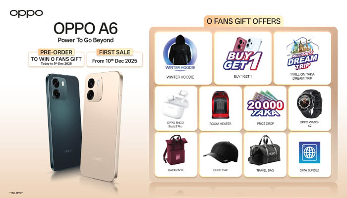 যে সকল ক্রেতা অপো এ৬ প্রি-অর্ডার করছেন, তারা ও’ ফ্যানস ফেস্টিভাল লটারি অফারে অংশগ্রহণের সুযোগ পাবেন। এছাড়াও, মিলিয়ন টাকা ড্রিম ট্রিপ, বাই ওয়ান গেট ওয়ান, অপো এনকো বাডস৩ প্রো, অপো ওয়াচ এক্স২, রুম হিটার বা প্রত্যেক অংশগ্রহণকারীর জন্য নিশ্চিত উপহার হিসেবে উইন্টার হুডি সহ নানান আকর্ষণীয় পুরস্কার জেতার সুযোগ রয়েছে।