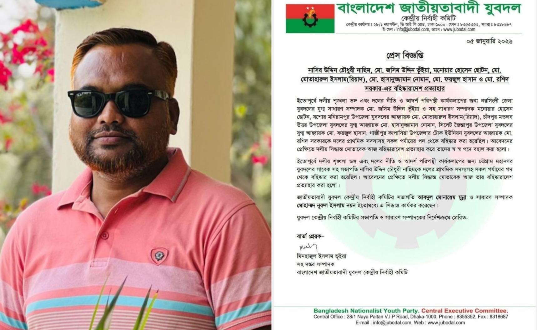 সোমবার (০৫ জানুয়ারি) বাংলাদেশ জাতীয়তাবাদী যুবদল কেন্দ্রীয় নির্বাহী কমিটির এক প্রেস বিজ্ঞপ্তিতে এ তথ্য জানানো হয়। যুবদলের কেন্দ্রীয় কার্যালয় থেকে প্রেরিত বিজ্ঞপ্তিতে উল্লেখ করা হয়, আবেদনের প্রেক্ষিতে কেন্দ্রীয় সিদ্ধান্ত অনুযায়ী তার বহিষ্কারাদেশ প্রত্যাহার করা হয়েছে।
