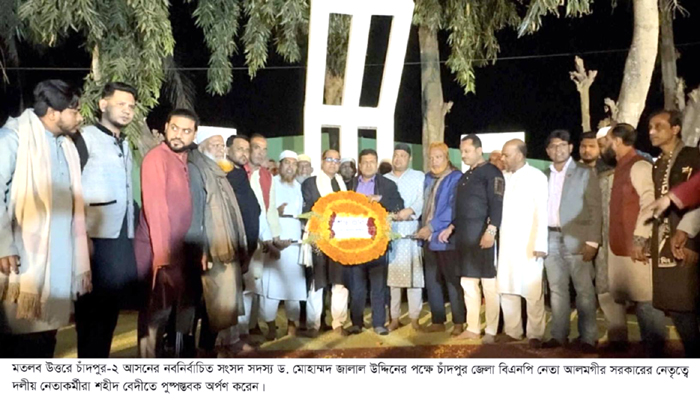 চাঁদপুর-২ আসনের নবনির্বাচিত সংসদ সদস্য ড. মোহাম্মদ জালাল উদ্দিনের পক্ষে চাঁদপুর জেলা বিএনপি নেতা আলমগীর সরকারের নেতৃত্বে দলীয় নেতাকর্মীরা শহীদ বেদীতে পুষ্পস্তবক অর্পণ করেন।