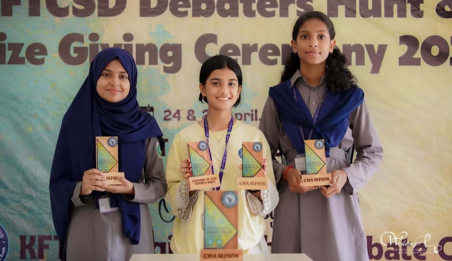কেএফটি কলেজিয়েট স্কুল ডিবেট ক্লাব আয়োজিত ‘ডিবেটার হান্ট ২০২৬’ প্রতিযোগিতায় বিজয়ী বিতার্কিকদের হাতে ক্রেস্ট তুলে দেওয়া হয়। ছবিতে চ্যাম্পিয়ন ও সেরা বিতার্কিকরা।