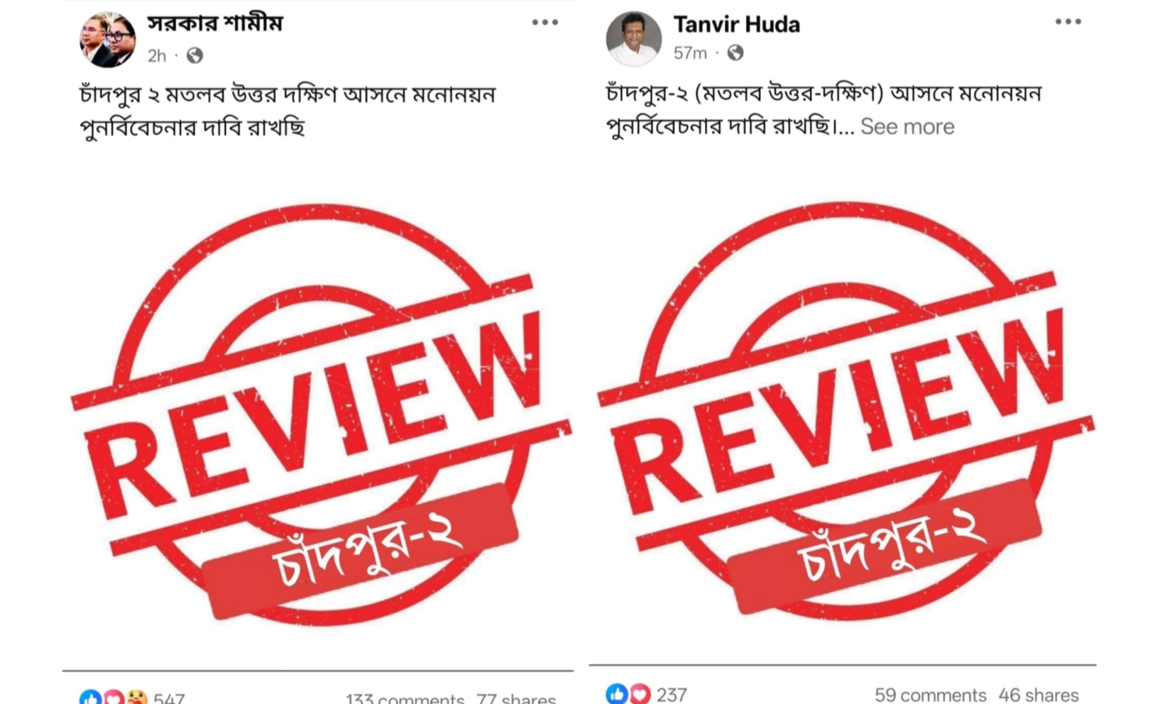 চাঁদপুর-২ আসনে বিএনপির মনোনয়ন নিয়ে তীব্র প্রতিক্রিয়া: সরকার শামীম ও তানভীর হুদার পক্ষ থেকে মনোনয়ন পুনর্বিবেচনার দাবি