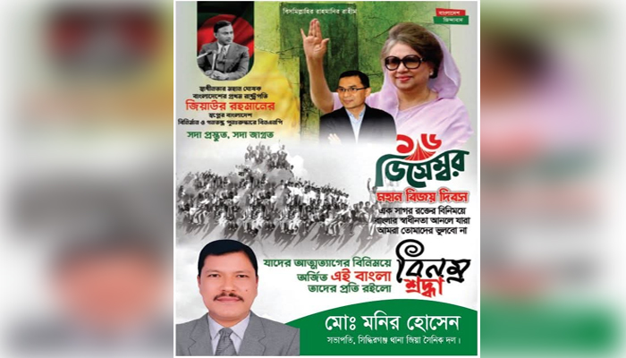 প্রতিদিনের নিউজ: মহান বিজয় দিবসের শুভেচ্ছা ও অভিনন্দন জানিয়েছেন বাংলাদেশ জাতীয়তাবাদী জিয়া সৈনিক দলের সিদ্ধিরগঞ্জ থানার সভাপতি মো. মনির হোসেন।