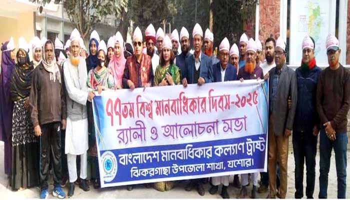 আফজাল হোসেন চাঁদ: যশোরের ঝিকরগাছায় ৭৭ তম বিশ্ব মানবাধিকার দিবস উপলক্ষে বাংলাদেশ মানবাধিকার কল্যাণ ট্রাস্ট ঝিকরগাছা উপজেলা শাখার উদ্যোগে র্যালী