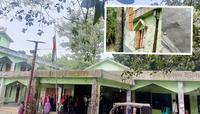 ফাটল ধরা পিলার, খসে পড়ছে ছাদ মতলব উত্তরে বিপজ্জনক ইউপি ভবনে চলছে কার্যক্রম