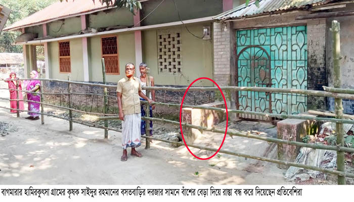 বাগমারা প্রতিনিধি: বাগমারার হামিরকুৎসা ইউনিয়নের হামিরকুৎসা গ্রামের কৃষক সাইদুর রহমানের বসতবাড়ীর দরজার সামনে বাঁশের বেড়া দিয়ে রাস্তা বন্ধ করে দিয়েছে