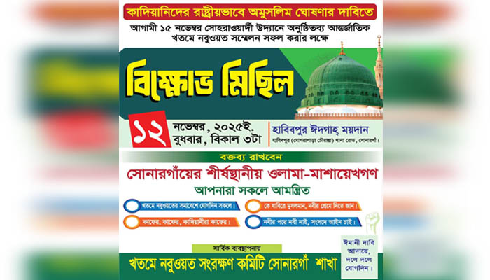 কাদিয়ানিদের রাষ্ট্রীয়ভাবে অমুসলিম ঘোষণার দাবিতে সোনারগাঁয়ে বিক্ষোভ মিছিল ১২ নভেম্বর
